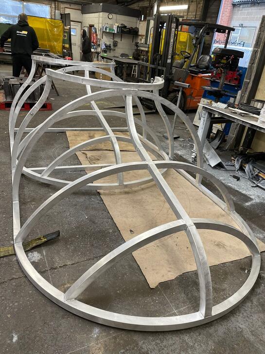 Working with Matty, Interesting Projects and Now gallery I was commisioned to design and make a large scale shoulder frame to become the base of Matty's oversized crochet pieces. Alongside the giant shoulder frame sat two giant hoops that hung the oversized sweater sleeves. Each piece was constructed from aluminium box tubing and constructed at Stratford Metal fabrications.