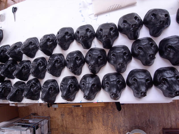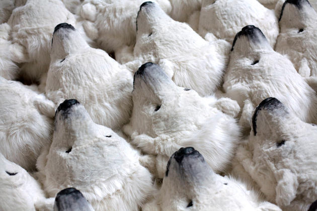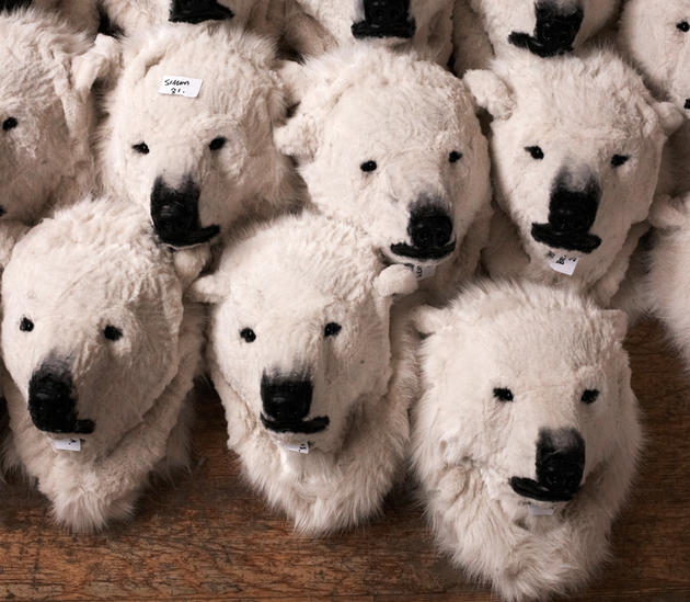 The Greenpeace Polar bears are the biggest hand made props I have made to date. Over the past 2 years I have created 102 Polar bear heads for Greenpeace for their international Save the Arctic campaign, each one meticulously created by hand. Sculpting a clay Polar bear face that was then moulded in fibreglass and finally vacuum formed in black plastic created the initial head base. Each head was set on an adjustable purpose built helmet that was then covered in fur. The fur cover was pattern cut to a perfect fit, glued to the face and groomed by hand. The final polar bear is brought to life by hand drawing the bears jowls and whiskers.